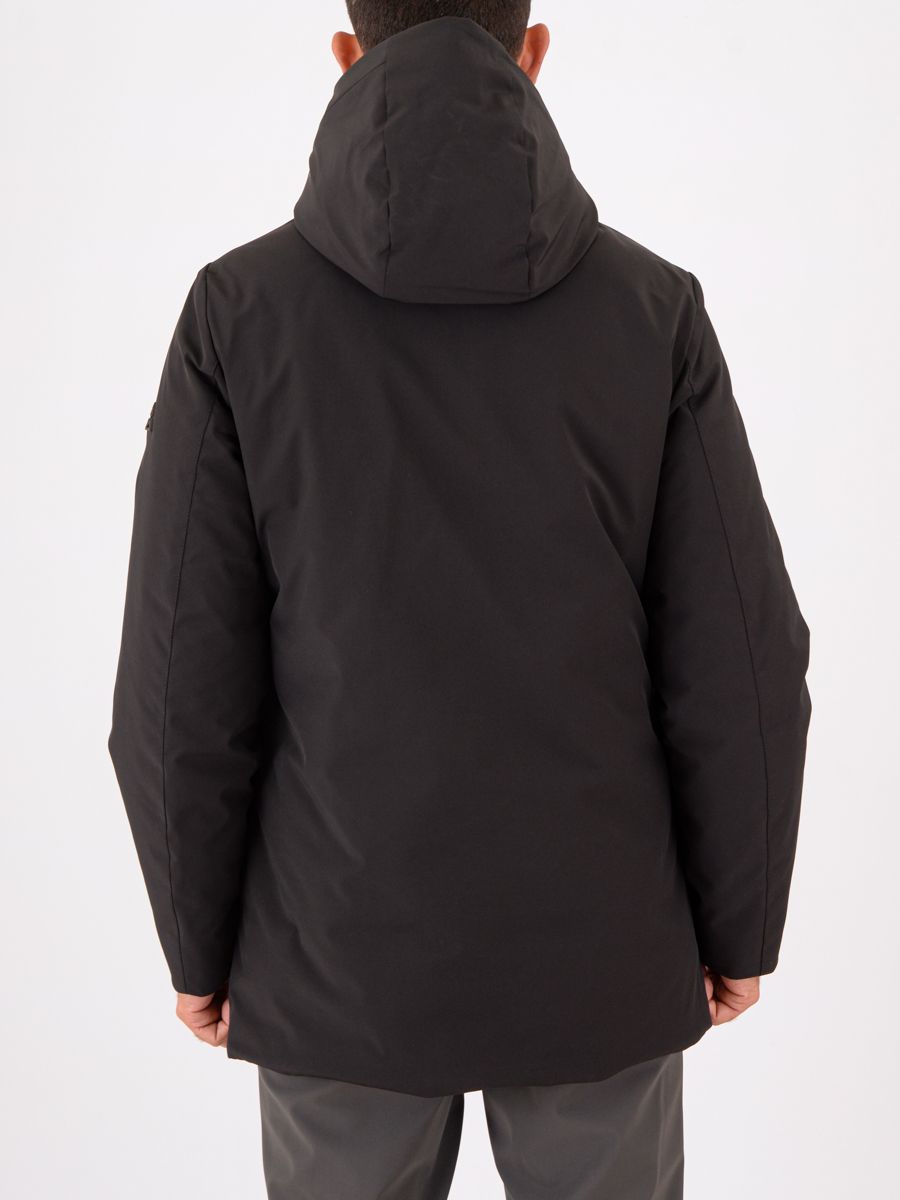 Technical nylon jacket with a fixed hood, featuring a minimalist design and clean lines. The central waterproof two-way zip closure ensures protection and practicality. Equipped with side pockets with heat-sealed zips, it is designed for maximum comfort on cold, rainy days.