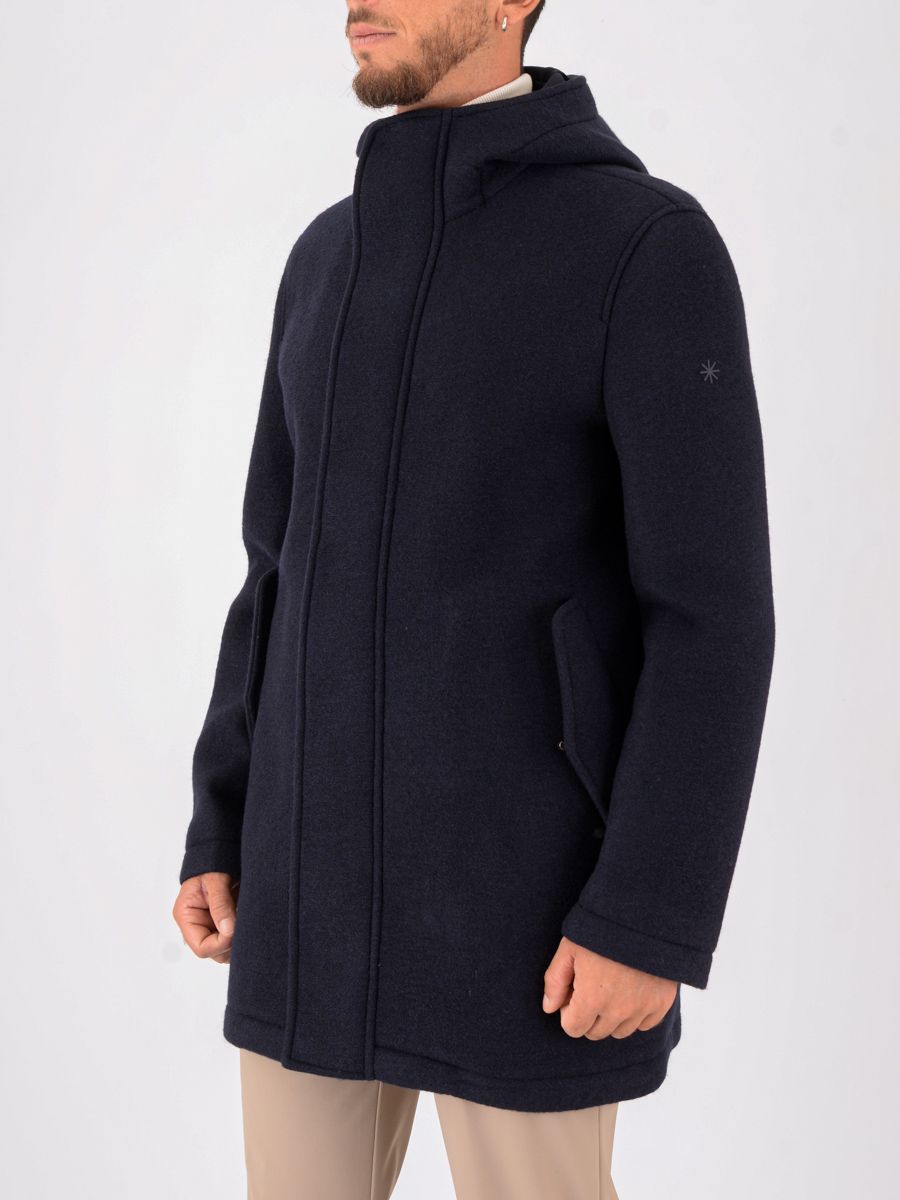 Parka dal design moderno e funzionale, realizzato in scuba tecnico accoppiato stretch per garantire comfort e protezione. Il modello presenta cappuccio fisso, chiusura frontale con zip e bottoni a pressione a scomparsa, due tasche frontali e finiture con impunture sul davanti che ne valorizzano la struttura. Il logo sulla manica aggiunge un tocco distintivo. Un capo versatile, ideale per affrontare la stagione fredda con stile urbano e praticità.